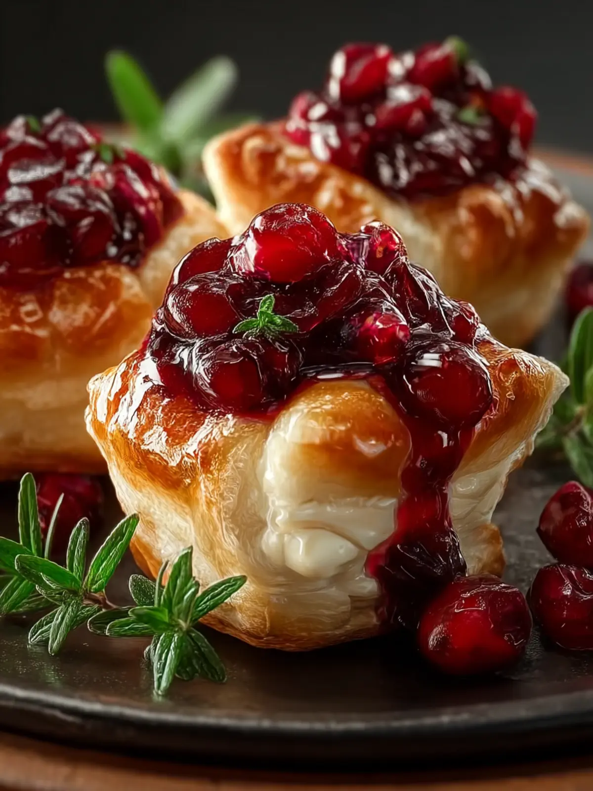 Delicious puff pastry bites filled with brie and cranberry sauce, perfect for appetizers or snacks.