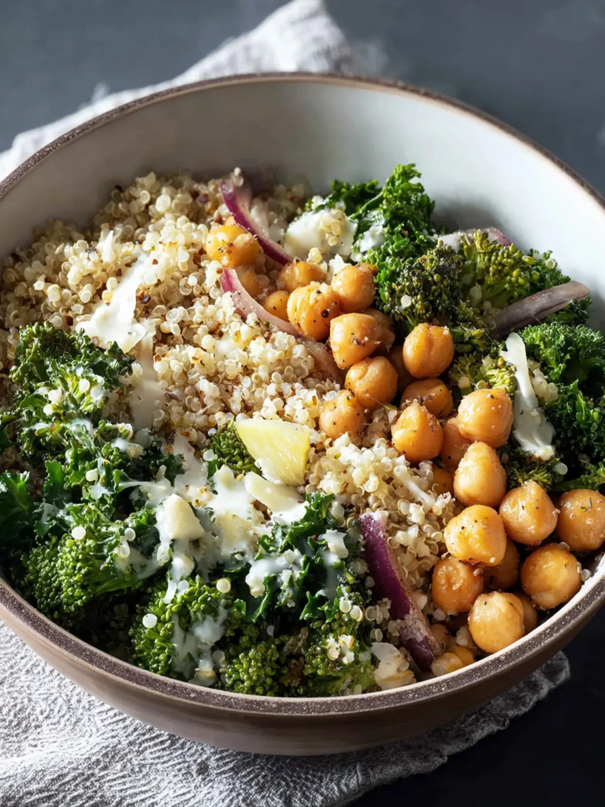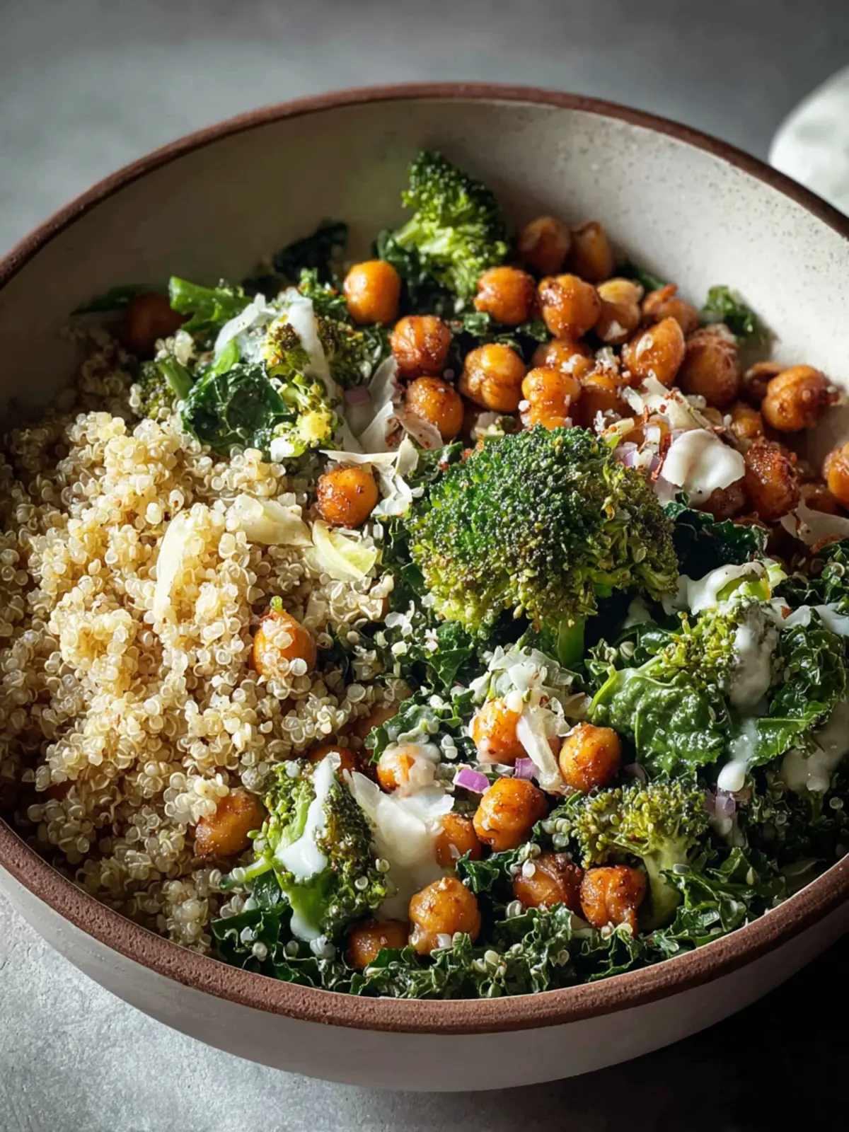 Fresh, leafy kale is the star here, offering a rich source of vitamins and minerals, while the chickpeas add a hearty boost of protein and fiber. Quinoa, celebrated for its nutty flavor, serves as a delightful base that keeps you full longer. But let’s not forget the broccoli! Lightly steamed, it brings a delightful crunch and vivid color that makes this dish visually appealing.