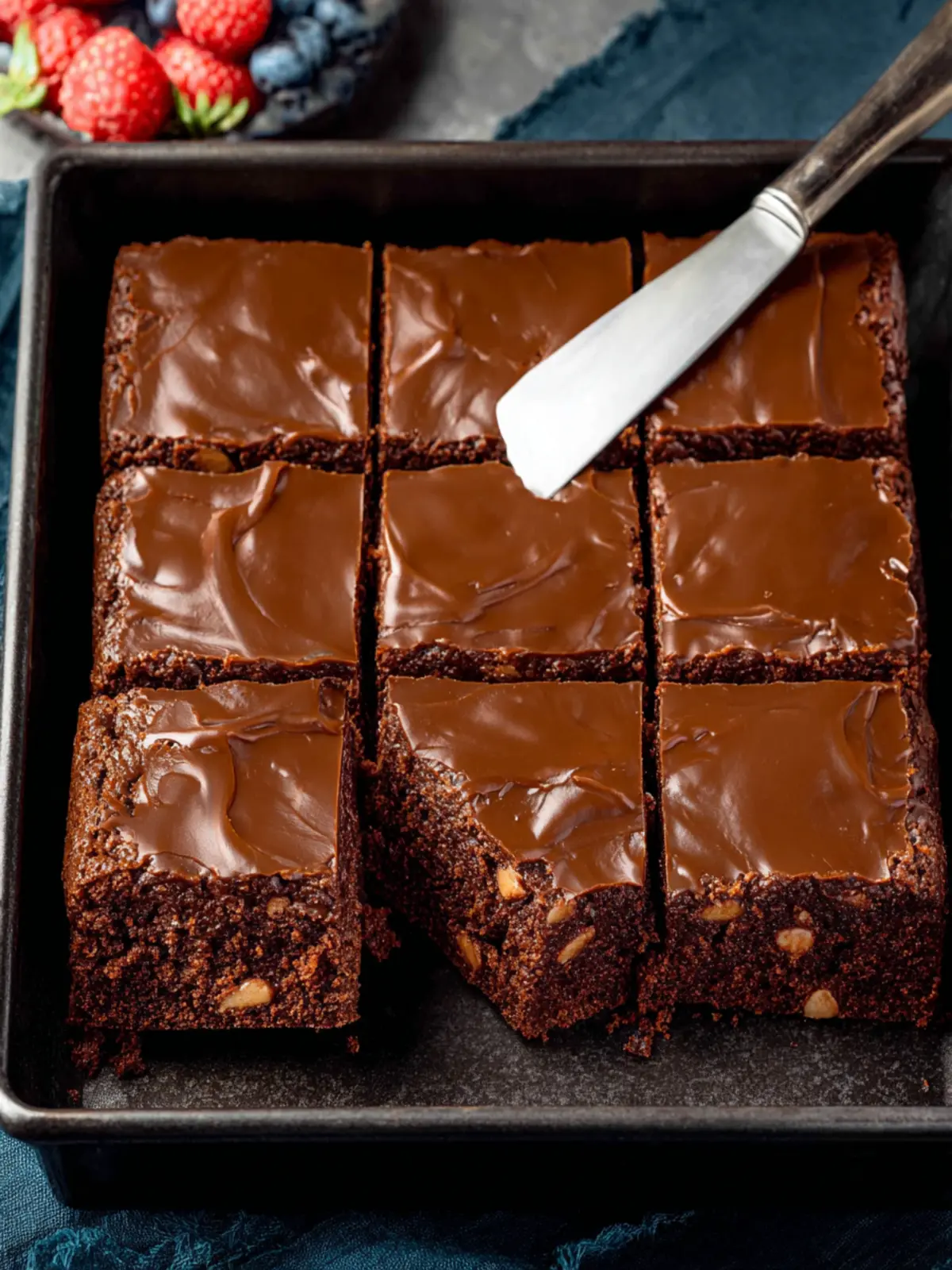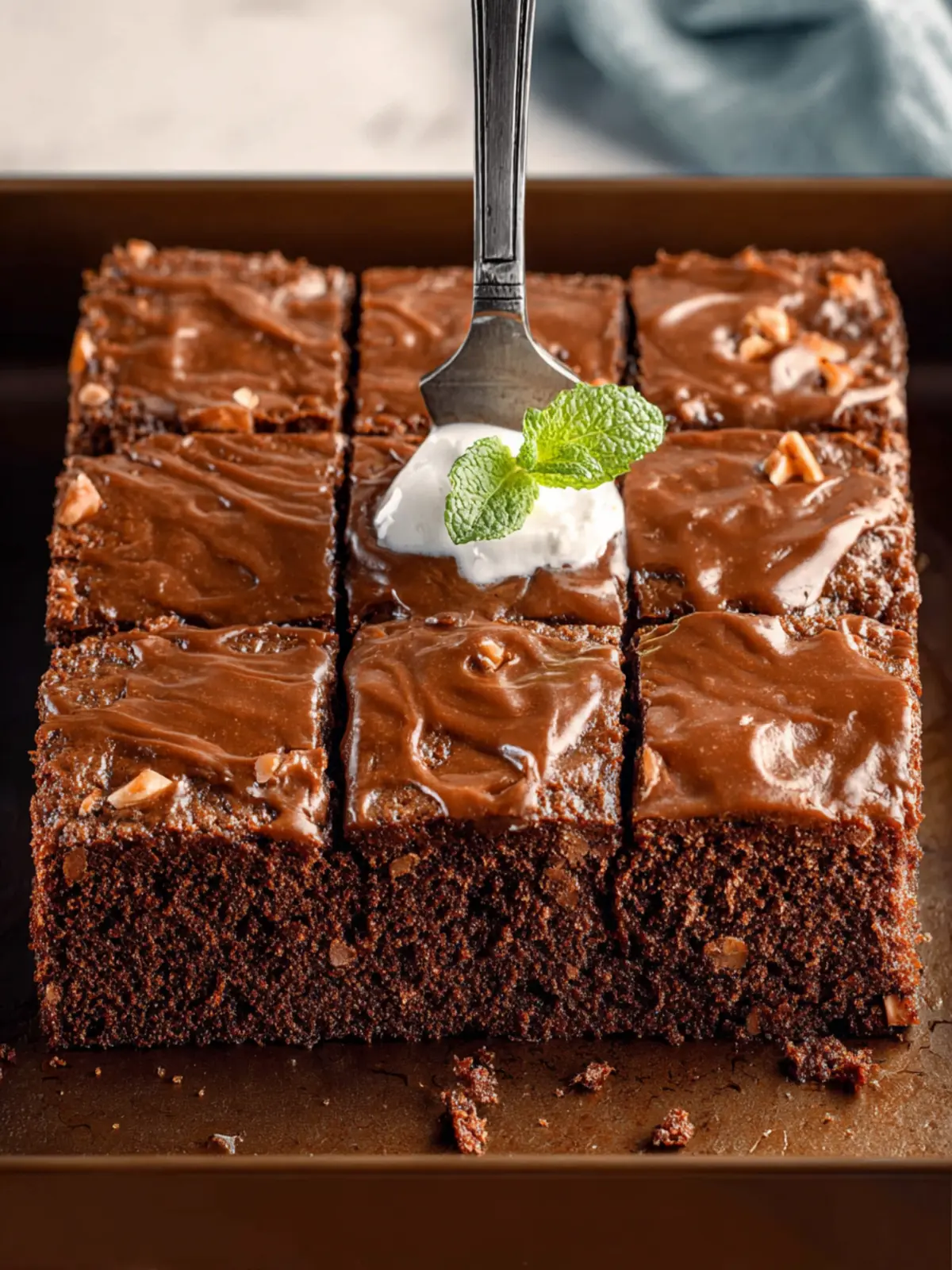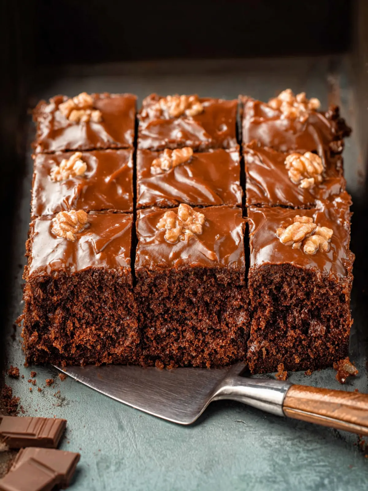 A moist and delicious chocolate sheet cake topped with chocolate frosting and walnuts.