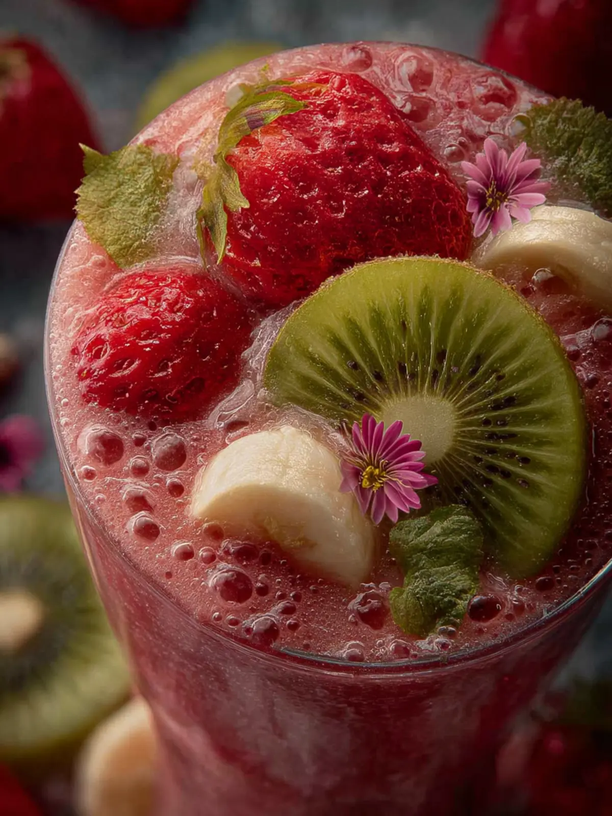 Preparation takes about 10 minutes. Start by washing and slicing your strawberries, peeling the bananas, and cutting the kiwi into chunks. Having everything prepped means your blending will go smoothly.